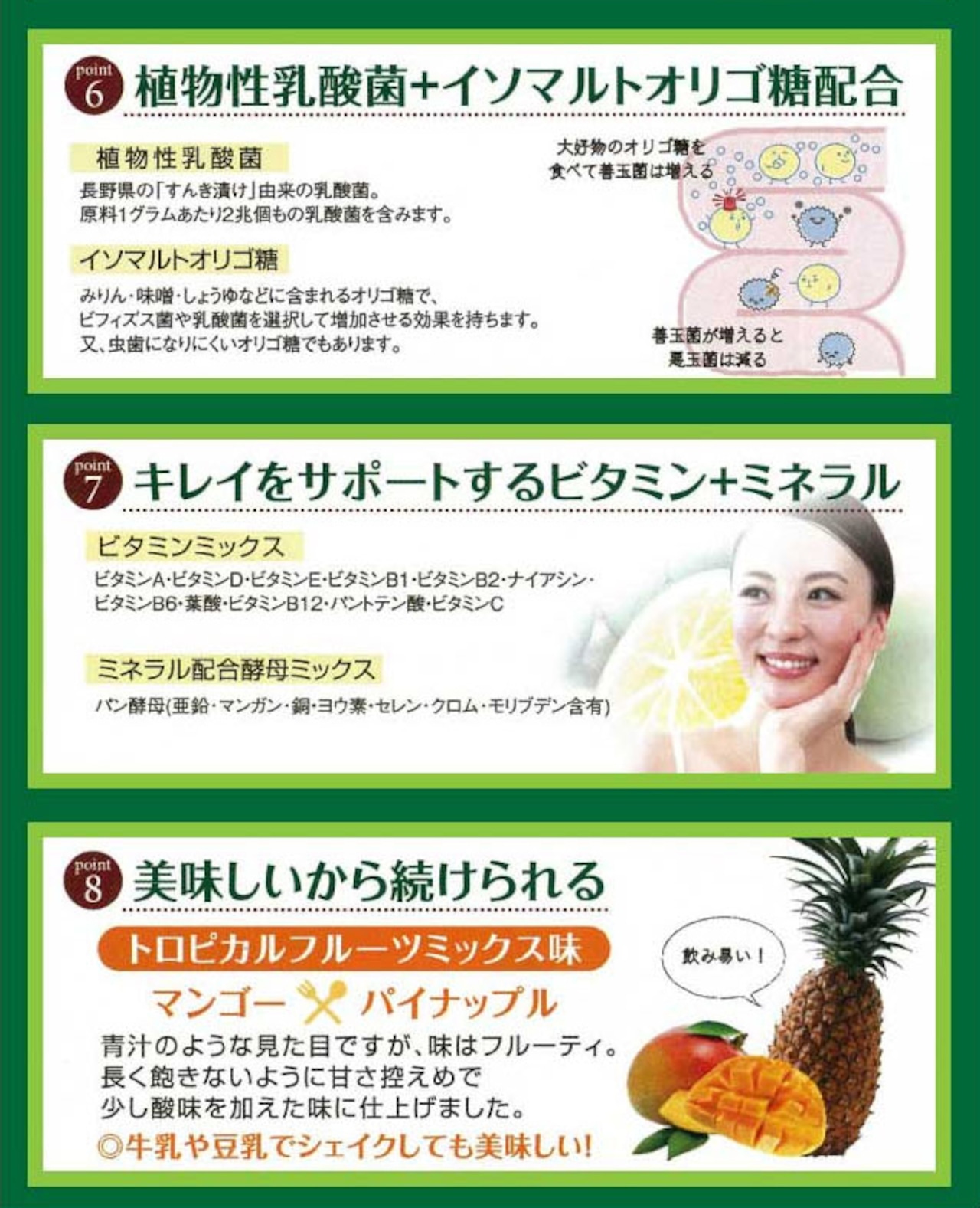 172種類の植物発酵エキス、植物性乳酸菌、食物繊維を配合しました。